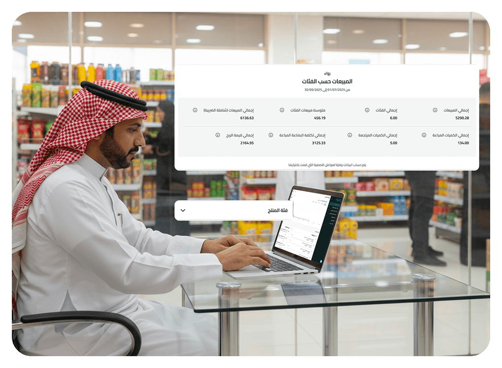 - تقدر تعرف مبيعات المشروبات لحالها أو مبيعات المنظفات، أو حتى المنتجات المستوردة. كل فئة لها تقاريرها اليومية والشهرية.