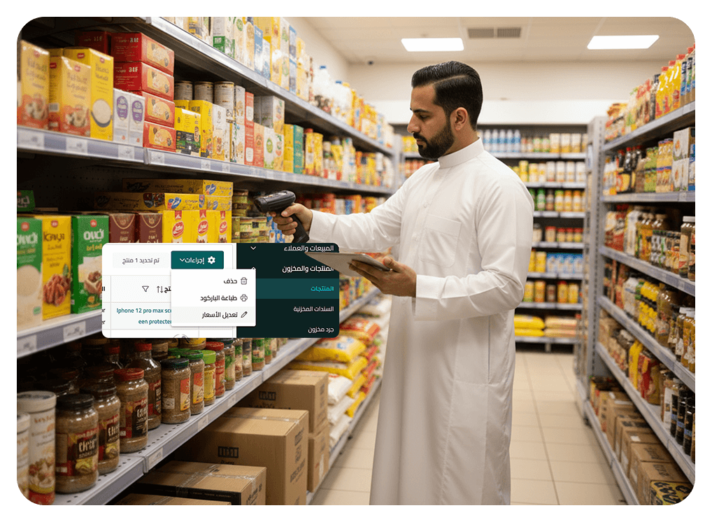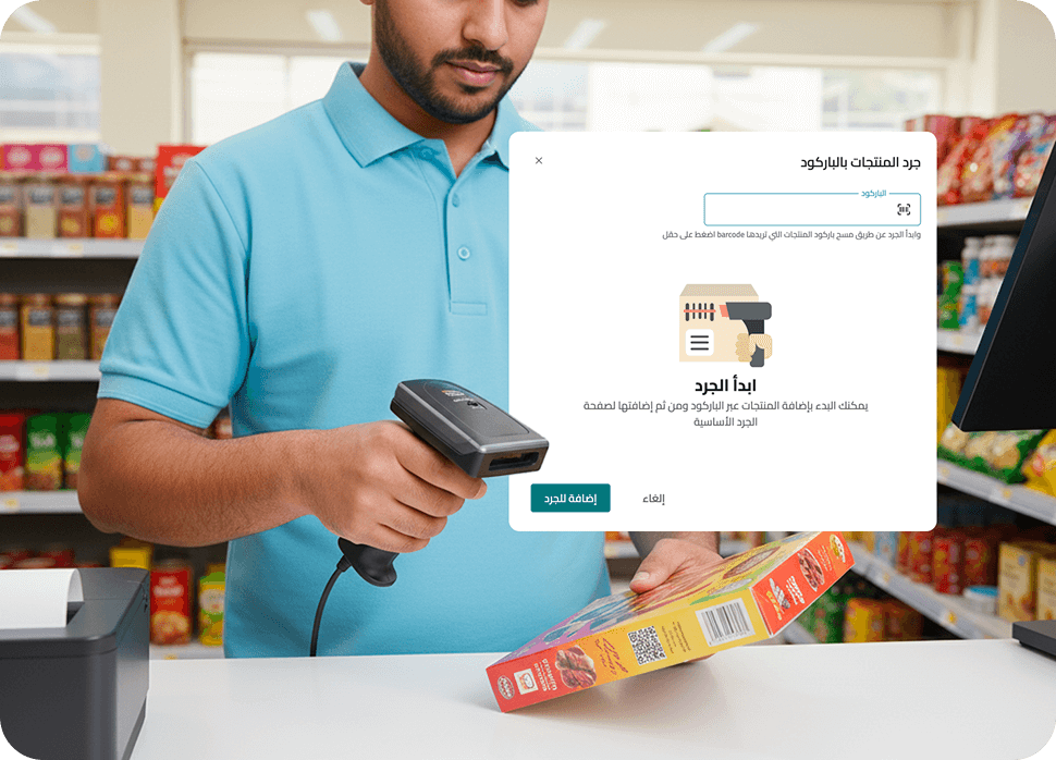 - من الرز والسكر والزيت إلى أصغر منتج على الرف، تقدر تضيف وتتابع كل صنف بالباركود عشان ما تضيع أي كمية ولا تضيع بين المنتجات.